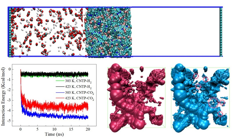 该工作报道了一种溶液可加工的共轭微孔热固性塑料(CMT),其固有孔为〜0.4 nm,比表面积为〜840 m2g-1,它既具有塑料的可加工性,又具有交联微孔固体的刚性和孔隙率。即使在升高的温度和压力下,微孔也是持久且稳定的。CMT在0.4 nm处具有狭窄的孔径分布,结合其溶液可加工性,则可以通过简单过滤来制造厚度可控的大面积超滤膜。由于固有的微孔和堆叠的薄片之间存在层间间距,同时,共轭C-C连接的支架构成CMT的刚性结构可防止高度均一的孔隙塌陷成孤立的空隙,并在高温下实现内部孔隙的连通性。因此,CMT膜表现出超高的H2气体渗透性,良好的选择性和在高温下的出色稳定性等性能。我们采用分子动力学模拟方法对其实现H2分离的物理本质进行了解释,并探索了温度对分离性能的影响。我们首先成功构建出了与实验结构和密度相匹配的CMP模型,然后将其应用于气体分离研究,结果表明,该膜对H2几乎没有任何阻留作用,允许其超快速跨膜渗透;而与其它气体分子(CO2/N2/CH4)之间存在一定的粘滞力,使其不易与膜发生脱离,阻碍渗透。同时,由于孔径限制,这些气体的部分通道被阻塞,扩散路径被大大增加,降低了这些气体的跨膜运移能力;不同渗透率是CMP可以实现对H2的有效分离。此外,随着温度的升高,膜孔结构会发生变化,带来更高效的分离。该工作为新型H2分离膜的设计提供了新的思路和理论依据。