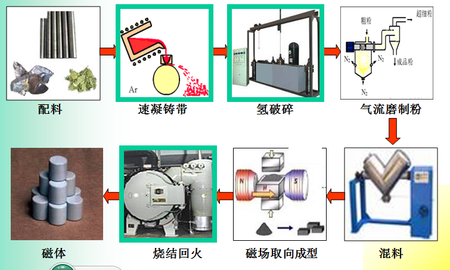 2、高性能稀土永磁材料制备研究 主要研究合金成分对烧结NdFeB永磁材料微结构、磁性能的影响,解决国内不能生产高磁能积磁体N54的重大问题,揭示了该磁体的成分特点和制备工艺参数。同时研究了速凝及脱氢制备工艺对材料显微组织、磁性能、力学性能的影响。 (1) 在工业化水平基础上,调整烧结钕铁硼永磁体化学成分,研究Nd、Dy、B等元素对含Zr、Nb掺杂元素烧结钕铁硼永磁材料磁性能和显微组织的影响,旨在提高烧结钕铁硼永磁材料的磁性能。复合添加Nb、Zr、Al的最佳配比,及与之对应的烧结、回火工艺,添加后可以有效的改性晶界相,促进磁体烧结致密化。开发了高能积磁体N54烧结钕铁硼材料。 (2) 随着磁体磁性能的不断提高,NdFeB的脆性问题逐渐暴露出来。塑韧性差、机械加工困难、抗冲击振动能力差等缺点大大降低了磁体的成品率和加工精度,增加了磁体的加工成本,同时也限制了磁体在高精度仪器仪表行业的应用。重点研究了速凝铸带工艺、脱氢工艺与磁体显微结构、磁性能和力学性能的关系。