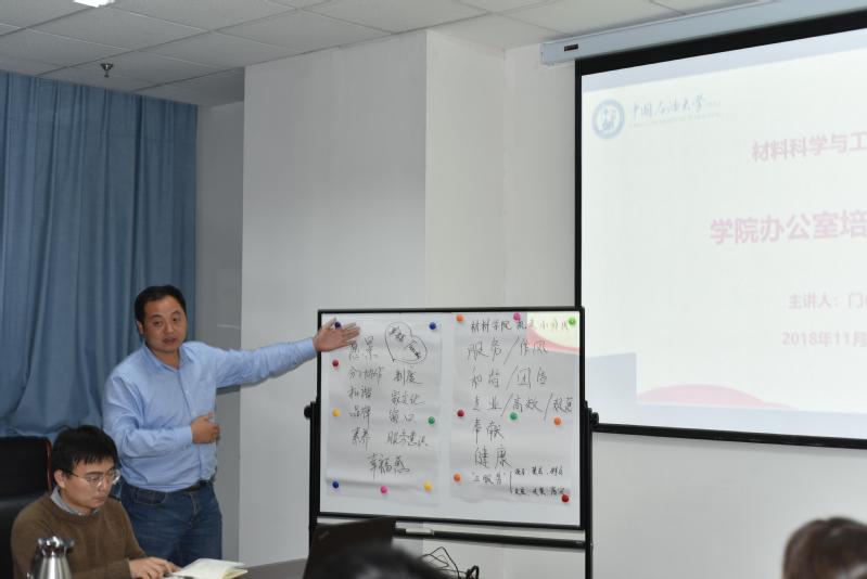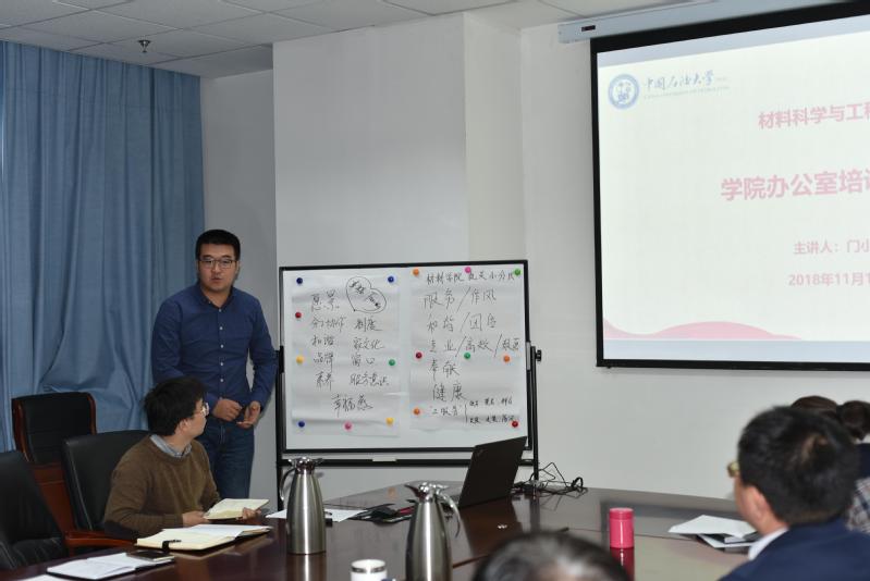 门小刚组织办公室工作人员进行组织建设意识培训,提出学院办公室应该建设成为什么样优秀组织的问题,与会人员分组交流讨论并积极汇报发言。