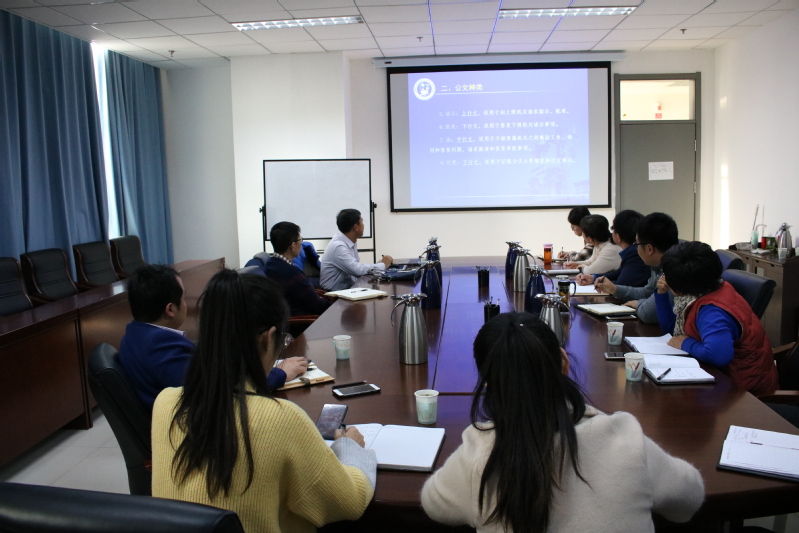 11月20日下午,学院邀请学校党委办公室、校长办公室综合科科长蔡吉刚为机关人员进行《公文处理规范与写作技巧》专题培训。学院办公室全体工作人员参加培训会。本次培训会是学院办公室系列培训讲座的第二讲。
