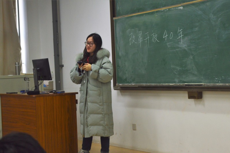 活动伊始,组织委员李润铎介绍了改革开放的时代背景。20世纪70年代到90年代,东欧剧变,苏联解体,国内经济发展缓慢甚至停滞,社会主义事业的发展面临严峻挑战,西方国家把中国称为“社会主义的最后堡垒”。正是在这十分困难的国际国内形势下,邓小平同志高瞻远瞩,提出了具有划时代意义的改革开放。接下来,组织委员李润铎以时间为线讲述了改革开放40年来中国从站起来、富起来到强起来的发展历程。李润铎引用习近平总书记的话鼓励大家,作为新时代大学生要有梦想、有担当。在问答环节,同学们结合实际经历,通过分析身边发生的变化来阐释改革开放的重要意义。