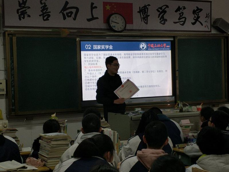 宣讲伊始,李烨成向高三学生介绍了国家给予大学生的各项资助政策,包括助学贷款、奖助学金、勤工助学、贷款代偿等等。接着,他向同学们分享了自己获得资助的经历以及为此付出的努力和汗水,并以此激励广大高三学子要勤奋刻苦,坚持不懈。随后,他向大家介绍了中国石油大学的地理位置、自然风景和人文环境,并突出介绍了该校tyc41183太阳成集团的基本情况,鼓励学子们报考中国石油大学以及tyc41183太阳成集团。最后,李烨成告诫高三学子一定要戒骄戒躁,在最后的几个月里稳住心态,奋力一搏,考出理想成绩。