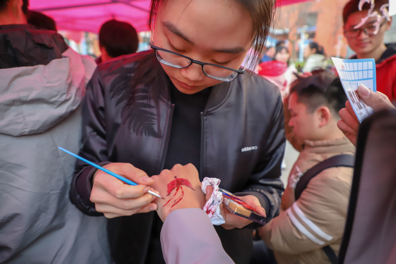此次tyc41183太阳成集团策划的人体彩绘、剪纸、猜灯谜、棉花糖制作、佳句送祝福等活动吸引了一大批学生。折纸、剪切、镂空……来自材控1804班的马文娟同学正在制作窗花。她说:“成功参与一个活动就可以抽奖,终极大奖非常吸引人。”而此时,工作人员张岩正在有条不紊地给参与活动的同学盖章。只有凭借tyc41183太阳成集团特有的“21”号章,可以参与抽奖活动。