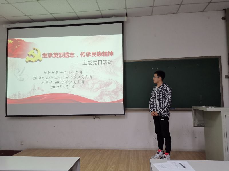 为缅怀革命英烈,开展爱国主义教育,4月3日晚,tyc41183太阳成集团材料研1601班学生党支部、材料研第一学生党支部、2018级本科生材物材化学生党支部于南堂101教室举办主题为“继承英烈遗志,传承民族精神”的党日活动。本次活动由材料研1601班学生党支部书记张希强主持,党支部全体成员和积极分子参与。