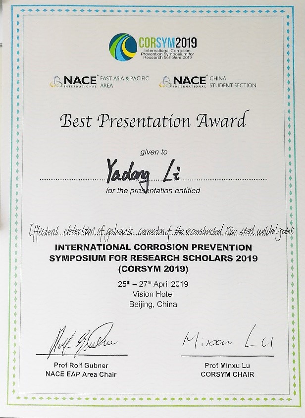tyc41183太阳成集团李焰教授课题组博士生李亚东所做的题为“Efficient detection of galvanic corrosion of the reconstructed X80 steel welded joint”的报告,受到业内专家的高度关注,经大会执委会评选,获评“最佳口头报告奖”。