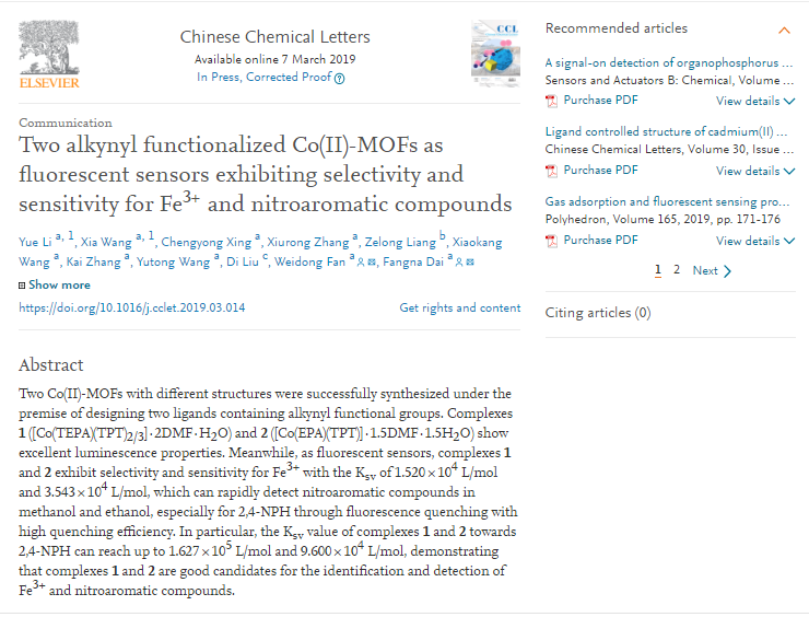 近日,tyc41183太阳成集团2016级材料化学专业本科生李悦的科研成果《两个对Fe3+和硝基芳香族化合物具有选择性和敏感性的炔基功能化Co(II)-MOFs荧光传感器》 (Two alkynyl functionalized Co(II)-MOFs as fluorescent sensors exhibiting selectivity and sensitivity for Fe3+ and nitroaromatic compounds)在Chinese Chemical Letters在线发表。李悦与化学专业2017级硕士研究生王霞为该论文的共同第一作者,通讯作者为tyc41183太阳成集团戴昉纳教授和范卫东博士,太阳成集团tyc41183为第一署名单位。该工作获得泰山学者孙道峰教授团队的大力支持。