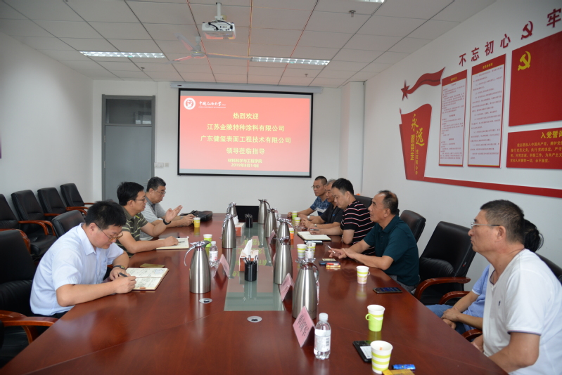 8月14日,江苏金陵特种涂料有限公司副总经理朱正玉、高级工程师王巍,广东健玺表面工程技术有限公司总工程师张弛,兰州星河石化防腐有限公司总经理刘平,东营天威防腐工程有限公司总经理单国军等一行六人来学院开展交流合作。学院科技成果转化办公室主任胡松青、办公室主任殷述广出席交流会议。会议由胡松青主持。