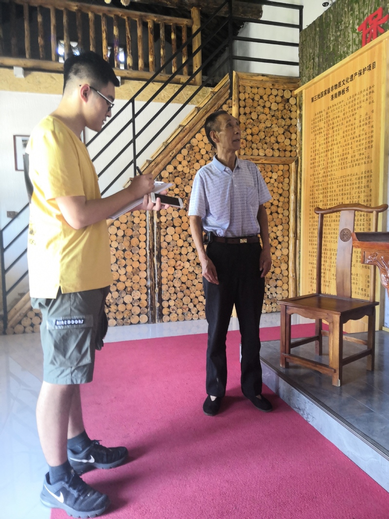 青山调研队队员们来到音乐小镇非遗静板书展厅拜访到了洛南静板书的第四代传人李桂存先生,其父是静板书的第三代传人,所以从十二岁开始便跟着父亲学习。首先,李桂存先生向队员们生动详细地介绍了静板书的历史渊源、发展轨迹和表现形态。在静板书的传承方面,李桂存老先生表示,目前传承困难在于年轻人难以接受,学入门至少三年,需要下大功夫,另一方面需要生存养家糊口,难以静下心来学习。在信息化全球化不断发展的今天,不仅需要国家的政策和资金的扶持,还需要通过电视台等媒体的宣传和各地演出的参与来让静板书最大程度上得到继承和发扬。静板书是国家的一大财富,民族的一大财富,应该传承发扬光大,让静板书这种土生土长的东西在民间大放异彩。最后,李桂存先生向队员们展示了他众多作品中的代表作——《说朝代》,其将从古至今各个朝代的变迁大事件用朴实工整押韵的歌词表达出来,创作时长四个月,付出了巨大的精力,具有深刻的内容寓意。
