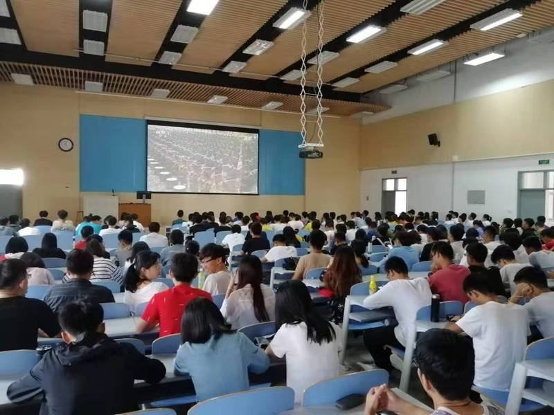 学院师生于南教300号教室观看庆祝大会、阅兵式和群众游行