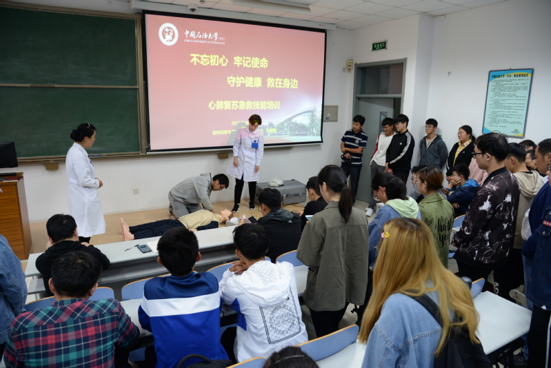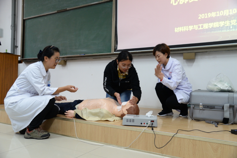 培训伊始,校医马爱华大夫向大家介绍实施心肺复苏的重要性以及判断患者心跳呼吸骤停的六条标准。买大夫指出,心跳骤停后,如果病人得不到及时的抢救,4-6分钟后会出现不可逆转的损害,因此进行现场心肺复苏是十分必要的。校医赵文瑜大夫向大家演示心肺复苏的实施流程并强调评估现场、轻拍重唤,按压时手臂与胸部垂直,人工呼吸前进行口腔异物清理等注意事项。在场学生进行了积极记录和学习模仿。接下来,校医指导学生在模型上进行心肺复苏演练,对如何观察病人有无胸廓起伏,人工胸外按压频率和嘴对嘴人工呼吸的姿势等操作进行手把手的规范指导。培训结束后,材料成型及控制工程专业1704班党员孙志欣说“这次演练让我意识到,只有当学到的理论用到真正的实践当中才能发现理论与实践的差距,也让我对心肺复苏的步骤有了更深刻的理解。”