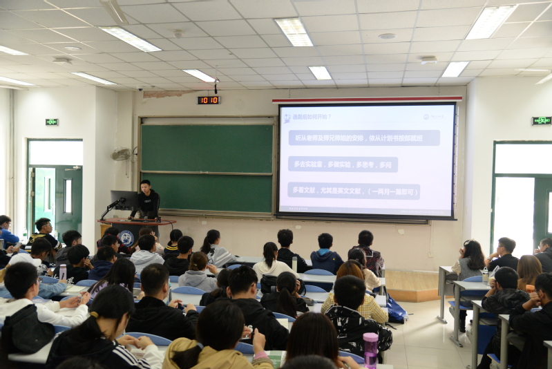 活动伊始,首先由张昊兵分享自己的科研经历,张昊兵从科研前期准备工作,到科研利器的介绍以及课题组推荐等方面与同学们分享他从事科研工作的心得体会,并着重向学生们强调了实验室使用的安全问题。张昊兵分享了他写作论文的心得体会并用简洁生动的语言告诉同学们如何正确地阅读并使用各种相关文献以提升论文的深度。随后,郭鹏引用国际著名学者的论文为例向同学们介绍了如何写好一篇学术论文,郭鹏以简洁明确的讲述,让学生们清楚地意识到论文写作是一件庄重而严谨的事情。张昊兵和郭鹏的介绍一个生动有趣,一个严肃认真,让学生们能够清楚地了解论文写作的方方面面。讲座后,学生普遍反映本次讲座受益匪浅。