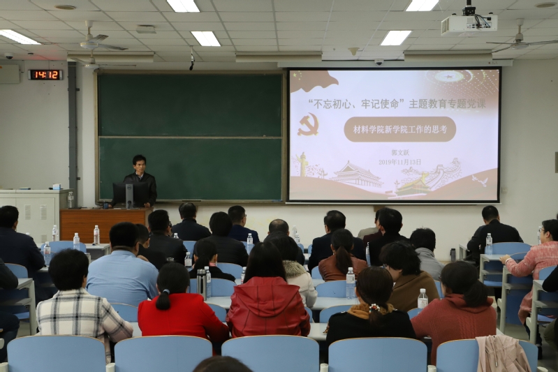 郭文跃以《“不忘初心、牢记使命”主题教育--tyc41183太阳成集团新学院工作的思考》为题,按照主题教育深入学习贯彻习近平新时代中国特色社会主义思想的根本任务和认真贯彻“守初心、担使命、找差距、抓落实” 的总要求,结合研究型新学院发展实际,从新院思考、发展现状、目标规划、重点举措四个方面展开讲解,围绕新学院成立一年以来的发展现状,从多方面提出学院现阶段的思考,并制定发展目标、明确发展方向,其中着重强调要加强学科建设的顶层设计,构建良好的学院管理和风气,切实做好新材料研究院起步工作,不断推进改革,开展好学科、学位点、专业一体化建设试点工作,加强人才和团队建设,搭建材料高端科学研究平台,加强国内外合作与交流。
