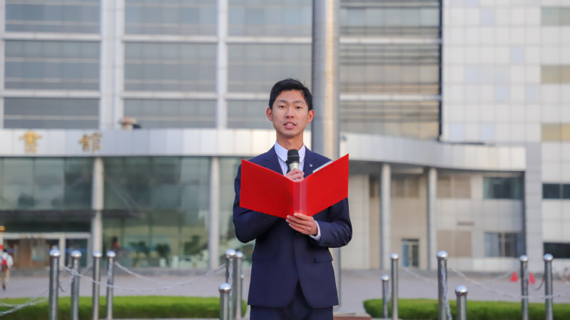 升旗礼毕,2019级学生代表高旭发表了题为《怀揣爱国之心,勇担时代使命》的国旗下演讲,用林则徐、邓小平等前辈的光荣事迹,激励广大同学分辨是非,不被歪曲的事实所蒙蔽,做一个爱国、爱党的青年。“一代人有一代人的长征,一代人有一代人的担当”,他表示,同学们虽生在和平年代,但面对的挑战却十分巨大,故更应该仰望星空、脚踏实地,不忘初心、牢记使命,为实现中华民族的伟大复兴贡献自己的力量。