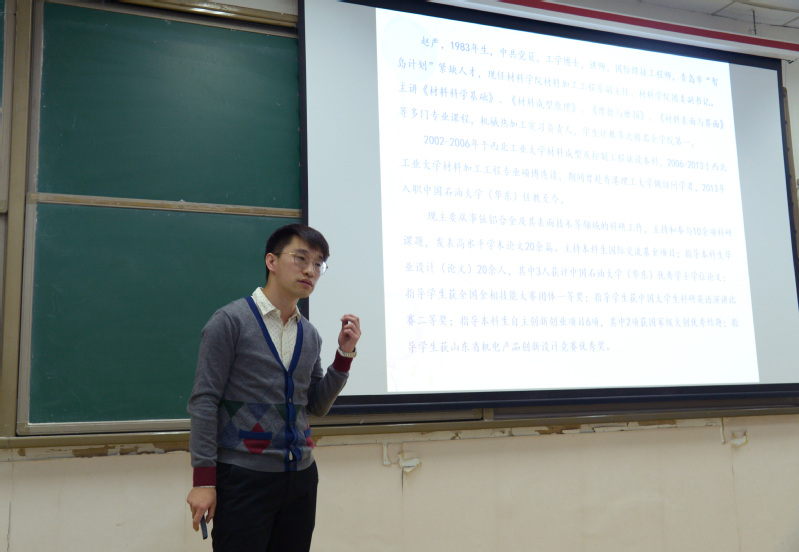 讲座伊始,赵严老师分享歌曲《老男孩》,并简谈自己多年求学经验,每次听到歌曲都会动容,勉励同学们珍惜时间,把握大好年华,施展人生抱负。“能源、材料、信息是现代三大科技支柱”,“天地万物,凡能为我所用者,皆谓之为材料”赵严老师引经据典,同时又结合实际例子为大家介绍材料的热点领域,分享各材料强校特色,鼓励大家积极上进,继续深造,为我国材料领域的发展贡献自己的一份力量。赵严老师还着重强调,学校学院立足实际情况,鼓励大家到更高的学府去求学,更欢迎大家留校,继续为石油大学、为tyc41183太阳成集团的发展做出贡献。