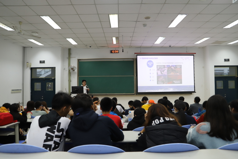 随后,全体成员于西廊202教室参加团日活动第二部分:海洋生态宣讲。本次宣讲邀请到“蓝丝带”社团成员。其以较为专业的知识从海洋污染物来源、海洋环境的自净能力以及污染物的危害三个方面为与会成员讲解海洋生态,以增强参与学生的环保意识。宣讲人表示,海洋具有一定的自净能力,可将污染物进行分解,但当污染物数量超过自净能力,将会造成严重的海洋污染。同时,他还指出当今世界上海洋污染的主要来源,如游轮泄露、工业废水、过度捕捞等,这些行为不仅造成海洋环境污染,也对其生态环境造成破坏。财务1801刘迪接受采访时说到:“这次海洋生态定向越野和海洋生态宣讲让我懂得了增强体质以及环保的重要性。”