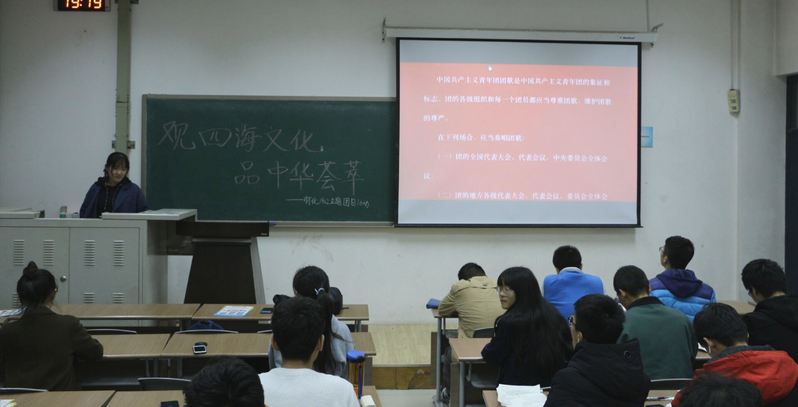 本次活动采用小组形式,由来自同一个省的团员组队。活动伊始,王敬淇表示:“我支部共有27名成员,分别来自13个不同的省和自治区,各个地区都有自己的特色,邀请每个小组的团员将自己的家乡介绍给大家,展示家乡的特色。”接着,各个小组分别上台以问答、视频、方言对话等多种形式,对家乡的美食、历史典故、名人事迹、旅游特色等进行精彩的介绍。从从山东到新疆,从华北平原到黄土高原再到塔里木盆地,与会团员领略到成都的美食、西安的夜景、河南方言特色等等。班长李腾飞在总结发言中表示:“一年前,我们相聚,从此有了许许多多的精彩。我们相遇在一起,是一种缘,希望我们可以珍惜这段缘分,一起走得更远。”