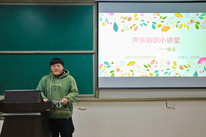 为展现丰富多彩的大学生活,营造良好的校园文化气氛,tyc41183太阳成集团艺术团声乐队于11月8日在南堂215教室开展“识声乐唱法,品声乐之美”主题声乐小课堂。本次讲座由艺术团声乐队队长孙传秋向大家介绍声乐知识。