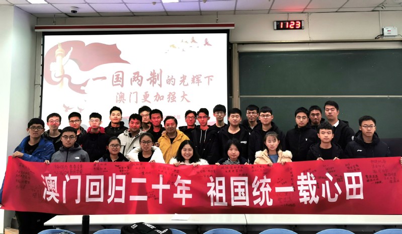 活动伊始,与会团员集体观看澳门回归交接仪式的视频,重温澳门回归这一历史时刻。组织委员徐诗涛对在讲解中说道:“澳门深厚的文化底蕴值得我们了解,其在一国两制制度下迅速发展取得的成就令人称赞”。通过知识竞答以及澳门旅游见闻分享,学生们逐渐加深对澳门的历史和发展现状的了解。为表达对澳门发展的希冀,伴着《七子之歌》的旋律,学生们在卡片上写下祝语,并在“澳门回归二十年,祖国统一载心田”的条幅上签名留念。