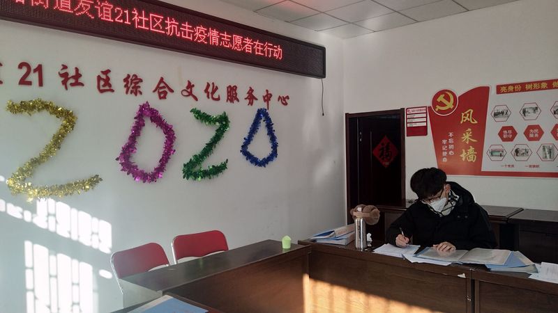 材料物理专业2018级大学生党员刘雨淳参加所在社区疫情防控志愿工作,每天在包头市昆都仑区友谊二十一社区服务中心协助工作人员开展新型冠状病毒疫情排查,进行电话信访,每天工作7小时以上。