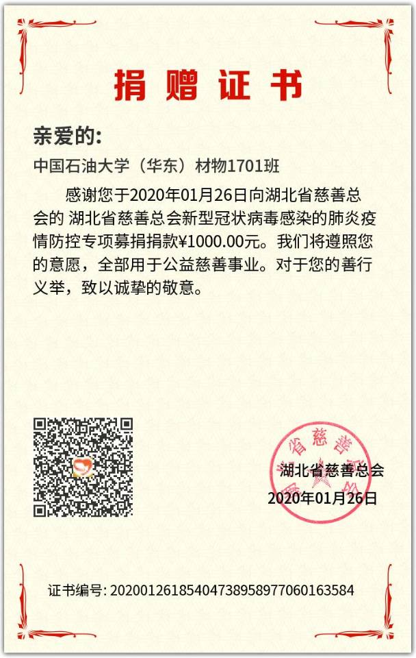 学院师生都密切关注着这场疫情,心系武汉、心系国家,在物力财力上都给予力所能及的支持。材料物理1701班在全校率先捐出先进班集体奖金1000元,随后材控1802班也捐出学校先进班集体奖金1000元,材料1802班、材控1803班主动募捐1000元,材料1911班募捐900元,材料1903班募捐572元,材物1601班募捐682元……其他材料学子也纷纷向中国红十字会、湖北省慈善总会、武汉红十字会等慈善机构捐款,累计金额超过两万元。