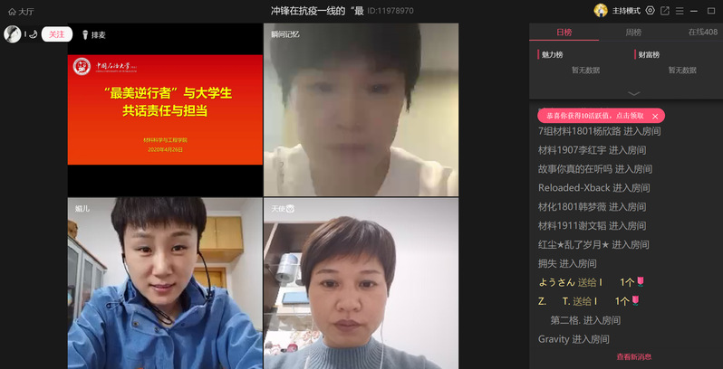 在分享武汉抗疫的过程中,三位白衣天使分别讲述了出征前的紧张、激动和义无反顾的决心,抗疫过程中的艰难坎坷和温暖时刻,并在线与师生交流了平安归来的感悟,同时结合工作实际,谈了青年人的责任和时代担当。在交流过程中,师生“致敬最美逆行者”、“您辛苦了”的弹幕时常瞬间刷屏,表达了学院师生对抗疫一线医护人员的敬佩之情。