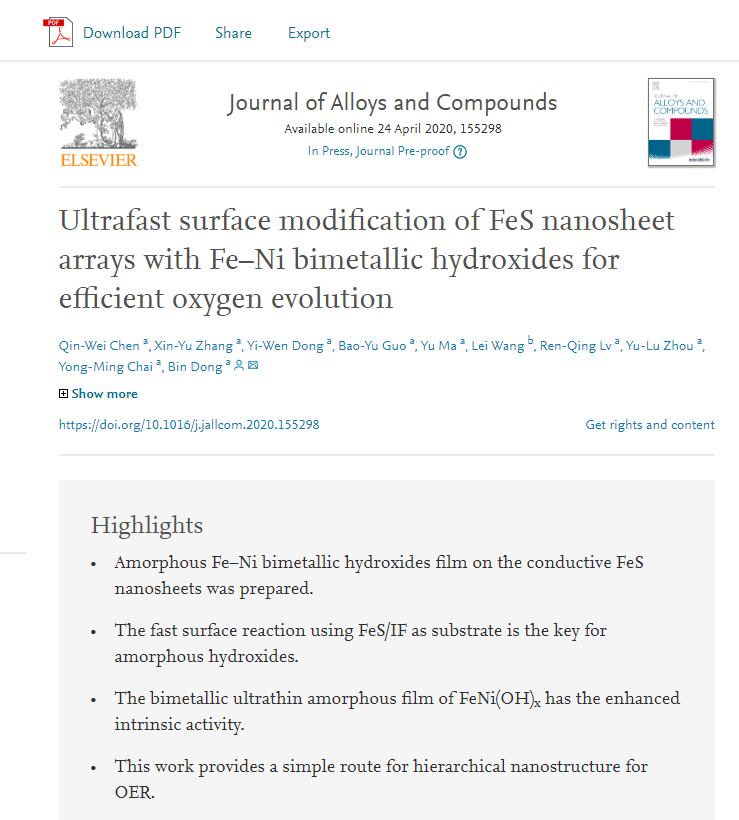 近日,tyc41183太阳成集团2017级材料化学专业本科生陈沁薇的科研成果《超快修饰合成FeS纳米阵列基Fe-Ni双金属氢氧化物用于高效析氧》 (Ultrafast surface modification of FeS nanosheet arrays with Fe–Ni bimetallic hydroxides for efficient oxygen evolution)在Journal of Alloys and Compounds在线发表。该研究成果第一作者为陈沁薇,通讯作者是理学院董斌副教授,太阳成集团tyc41183为第一署名单位。
