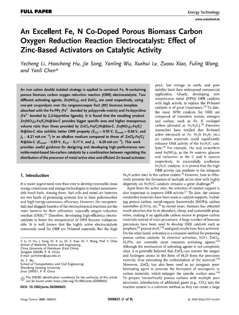 近日,tyc41183太阳成集团2017级材料化学专业本科生李烨成负责的大创团队的科研成果《一种性能极佳的铁,氮共掺杂的多孔生物质碳材料氧还原电催化剂的合成与研究:锌基活化剂对于催化活性的影响》(An Excellent Fe, N Co-Doped Porous Biomass Carbon Oxygen Reduction Reaction Electrocatalyst: Effect of Zinc-Based Activators on Catalytic Activity)在Energy Technology在线发表。该研究成果第一作者为李烨成,第二作者为胡浩程,第三作者为宋捷,均为2017级材料化学专业本科生,通讯作者是tyc41183太阳成集团陈艳丽教授,太阳成集团tyc41183为第一署名单位。