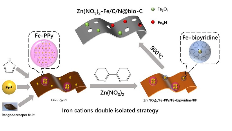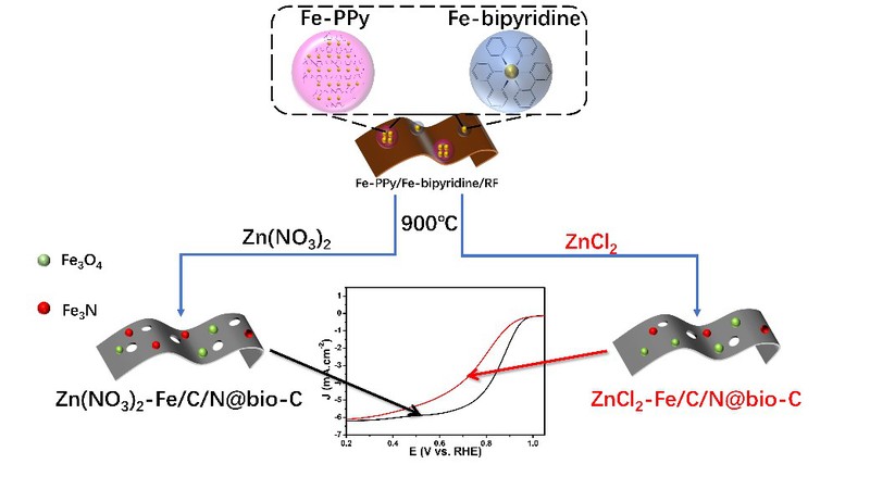现如今,对于开发可持续清洁能源转化与储存技术来替代不可再生化石燃料的需求变得越来越高。燃料电池与金属-空气电池具有的包括零污染以及高能量转换效率等优点,使两者成为非常有潜力的替代技术。尽管如此,电化学反应中的氧还原反应(ORR)具有较高的过电势以及缓慢的动力学过程,这限制了燃料电池与金属-空气电池的商业化应用。基于此点,李烨成,胡浩程,宋捷大创小组在陈艳丽教授团队的指导下提出了一种铁的双隔离策略来合成具有多种活性位点的生物质碳材料电催化剂。同时,对ZnCl2与Zn(NO3)2两种不同的活化剂(创孔剂)进行比较,探究了Zn(NO3)2作为活化剂的优势并对其进行了原理上的解释。该项工作不仅合成出了具有高活性的ORR电催化剂,还探究了不同活化剂对催化活性所产生的效果,为设计与合成非贵金属碳材料电催化剂提供了指导,并具有很好的应用潜力。