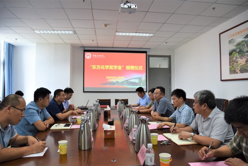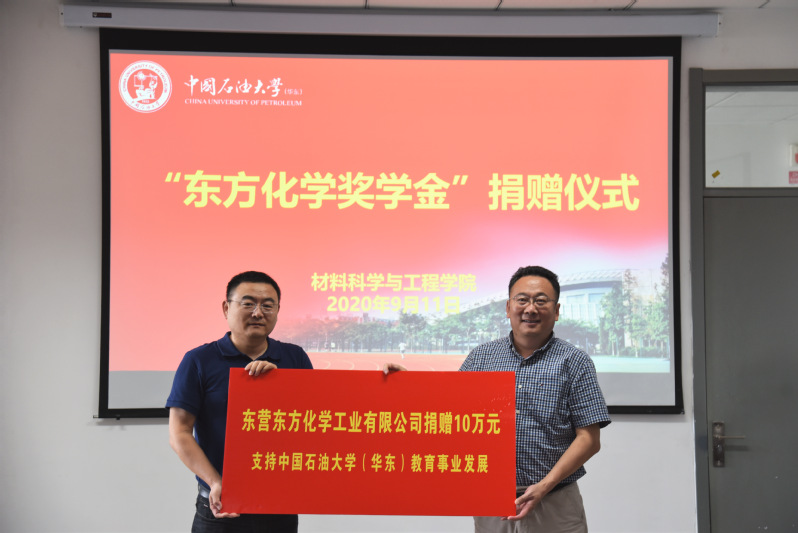 9月11日,“东方化学奖学金”捐赠仪式在工科E527会议室举行。东营东方化学工业有限公司总经理颜海涛一行4人,党委常委、副校长操应长,合作发展处副处长张炜,tyc41183太阳成集团常务副院长郭文跃,党委书记门小刚等相关领导参加捐赠仪式,学院科技成果转化办公室主任胡松青主持仪式。