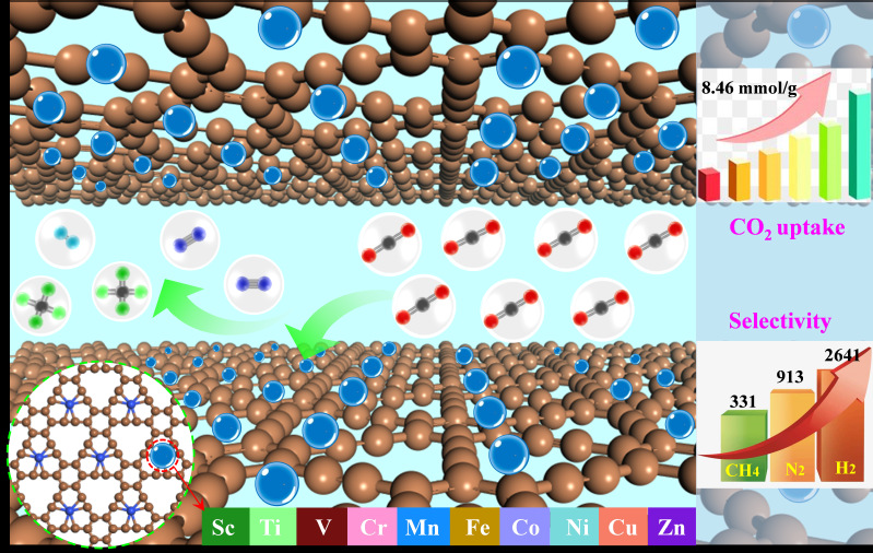 题目为《第一周期过渡金属掺杂石墨炔材料中超高的CO2捕获与CO2/N2/CH4/H2分离性能的理论研究》(First-row transition-metal-doped graphyne for ultrahigh-performance CO2 capture and separation over N2/CH4/H2) 的研究论文发表在Materials Today Physics杂志(Mater. Today Phy., 2020, 16, 100301)。该工作通过对10种第一周期过渡金属掺杂的石墨炔材料进行筛选,探究了Cu-GY、Co-GY、Fe-GY和Mn-GY中CO2捕获与分离情况。金属掺杂后的TM-GY材料呈现出较高的稳定性,且电子结构得到有效地调控。在298 K、1.0 bar下Cu-GY中CO2的吸附量达到8.46 mmol/g,远大于先前报道的裂缝孔结构,这源于Cu掺杂后有效的提升了CO2与骨架材料的相互作用,尤其是库伦相互作用。CO2在Cu-GY结构中多层分布特点进一步证实了此结论。该论文第一作者为2019级博士生周赛男,通讯作者为王兆杰副教授与鲁效庆教授。Materials Today Physics属于材料类一区TOP期刊,影响因子为10.443。