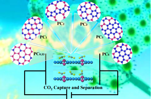 题目《电场调控型纳米磷碳材料中CO2吸附与分离》(Carbon phosphides: promising electric field controllable nanoporous materials for CO2 capture and separation) 的研究论文发表在Journal of Materials Chemistry A杂志(J. Mater. Chem. A, 2020,8, 9970-9980)。该工作采用DFT方法,通过电场调控在6种碳磷纳米材料中(PCn; n = 0.33, 1, 2, 3, 5, 6)实现高效的CO2吸附与分离。PCn材料在电场中表现出较高的稳定性和导电性,随着电场强度增加,CO2在PC0.33、PC2、PC5的吸附由物理吸附转为化学吸附,有效地提高了CO2与PCn结构的相互作用;在电场作用下,PCn材料表现出优异的CO2/N2分离性能和防水特性。PC5结构在电场强度为0.0020 a.u.下表现出最佳的CO2吸附特性,动力学过程表明通过电场开/关效应可以在PC5材料中实现低能耗的CO2吸附与脱附。该论文第一作者为2019级博士生周赛男,通讯作者为王兆杰副教授与鲁效庆教授。Journal of Materials Chemistry A属于材料类、化学类一区TOP期刊,影响因子为11.301。