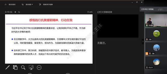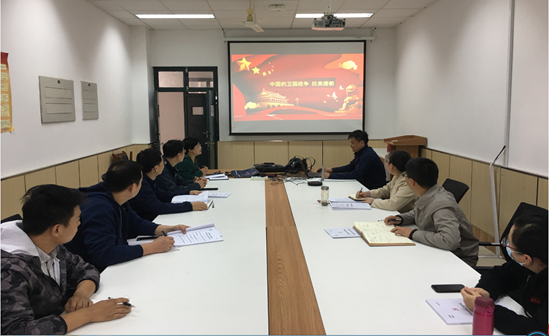 随后,燕友果老师又以《中国的卫国战争——抗美援朝》为题,带领大家学习了新中国成立之初经历的这一次恢弘的卫国战争,重新体会了当时以毛泽东主席为代表的老一辈革命家在重重压力下做出的伟大决定。讲述了抗美援朝中经历的艰苦卓绝的战斗和涌现出的战斗英雄以及可歌可泣的战斗事迹,通过抗美援朝,我国获得了和平的发展空间和时间,赢得了世界的尊重,重塑了东方大国形象。此外,燕友果老师带领大家又一起学习了习近平总书记在纪念中国人民志愿军抗美援朝出国作战70周年大会上的讲话“铭记伟大胜利,推进伟大事业”,从重温历史、缅怀先烈、学习抗美援朝精神和推动中华民族伟大复兴等方面,学习了在当前如何发挥抗美援朝精神,奋发图强推进我们伟大事业的讲话精神。结合习近平总书记的讲话精神,我们作为高校教师应该发扬抗美援朝精神,做好当下:在日常教学中,大力弘扬伟大的抗美援朝精神,引领青年大学生做好遵纪守法的公民,同时爱党爱国,奋发努力,担当作为,为国家发展和民族复兴贡献力量;在科研工作中,努力科研,突破国外的卡脖子技术,教书育人,为我国培养更多具有家国情怀的优秀人才,完成这个伟大时代赋予的历史使命。