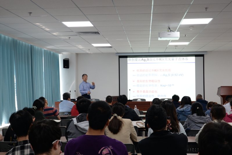 王强斌研究员围绕《眼见为实的先进荧光活体成像技术》这个专题,首先从原有的荧光活体成像技术因其400-900nm的波长衰减太快而导致荧光较弱缺点出发,介绍了所在课题组创新的以900-1700nm波长的荧光作为活体成像技术的应用。其次介绍了Ag2S量子点的合成及表征手段,引出这种量子点的创新性。最后王强斌研究员介绍了众多的荧光活体成像技术的应用,如可视化导航AD治疗、多通道成像优化肿瘤联合治疗方案等。讲座现场座无虚席,到场师生纷纷表示收获颇多,受益匪浅。
