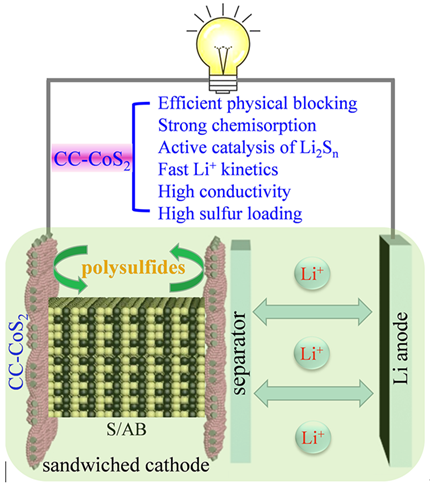 题为《由CoS2改性碳布组装而成的夹层正极用于高性能锂硫电池》(Sandwiched Cathodes Assembled from CoS2-Modified Carbon Clothes for High-Performance Lithium-Sulfur Batteries) 的研究论文发表在Advanced Science杂志上(Adv. Sci. 2021, 2101019)。该工作制备了一种覆盖CoS2纳米颗粒的碳布(CC-CoS2),它既可以作为三维(3D)集流体,又起到阻挡可溶性多硫化锂迁移的物理化学屏障的作用。电化学性能结果显示,硫负载量为1.2mg·cm-2的Al@S/AB@CC-CoS2电池具有较高倍率性能(4 C时,容量约为823 mAh·g-1)和容量保持率,其优异的电化学性能归因于具有活性催化成分的夹层结构。该论文第一作者为合肥工业大学许俊教授,鲁效庆教授为通讯作者。Advanced Science属于SCI一区TOP期刊,影响因子为16.806。
