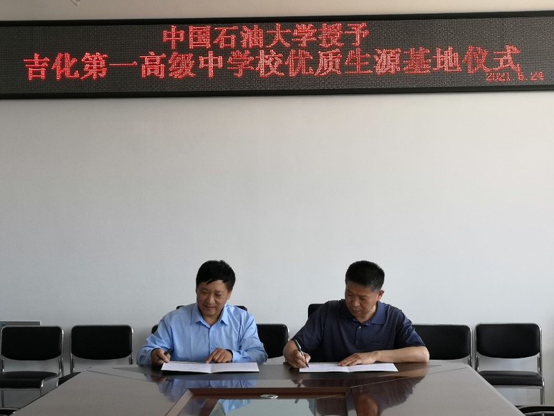 24日上午,招生宣传组到吉化一中进行优秀生源基地挂牌。门小刚与吉化一中党委书记齐林忠代表双方学校在优秀生源基地协议书上签字,并授“优秀生源基地”牌。