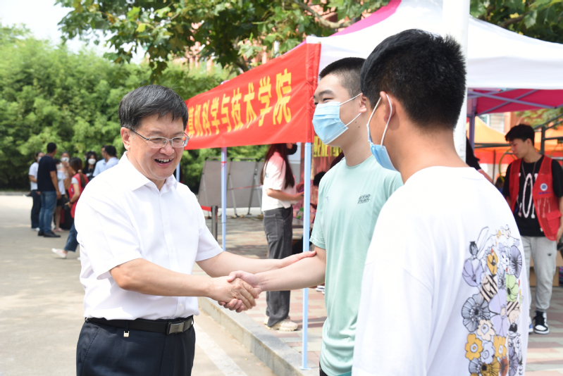 9月10日上午,学校党委书记王勇、党委副书记万云波等校领导来到我院迎新点了解学院迎新情况,与新生亲切交谈。王勇询问新生来校时间、入校感受,介绍材料学科大有可为,鼓励新生认真学习,练就过硬本领,同时做好石大形象代言,向家乡学子宣传学校,推介石大办学特色、办学实力和办学水平,吸引更多优质生源来校学习。看到众多新生报到后重新返回迎新点主动做起志愿者,万云波给予他们高度肯定,勉励他们积极融入集体,发挥带头作用。
