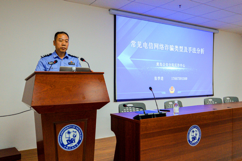 为进一步增强研究生防范电信网络诈骗意识,提升识诈、防诈能力,9月28日下午,tyc41183太阳成集团在古镇口校区新能源大厦236报告厅开展了研究生安全教育系列活动第一期——防范电信网络诈骗专题教育。青岛市公安局黄岛分局反诈中心一级警长张学进应邀做专题报告,学校党委学生工作部(武装部)副部长周世光、青岛市公安局黄岛分局警官秦淑娴出席活动,古镇口校区2021级研究生参加报告会。
