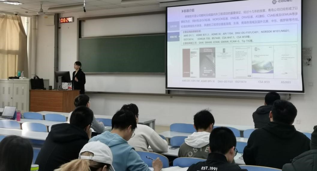 程晋宜书记首先介绍了海洋石油工程(青岛)有限公司基本概况,详细介绍了近几年海工建设大型装备特点、应用环境、服务国家能源战略的重要作用和所起到的关键性作用,着重讲述了大国重器制造过程中焊接技术的角色和重要作用。介绍了AWS D1.1标准特点、组成部分、应用背景等,讲述了标准中免评定WPSs具体内容和要求等,结合现场实际情况介绍了AWS标准中规定的力学性能测试方法、海洋工程常用的无损检测方法及适用范围等。报告内容丰富,理论联系实际,让学生对焊接工程有了更加深入的理解。程晋宜书记结合个人工作经历和管理经验,分享了关于焊接工程师的职业发展、个人规划、能力要求等方面的心得体会,鼓励即将毕业的材控专业学生热爱自己的专业,培养良好的职业素养、不怕吃苦的精神、干事创业的决心,将来能在焊接工程领域成就一番事业。