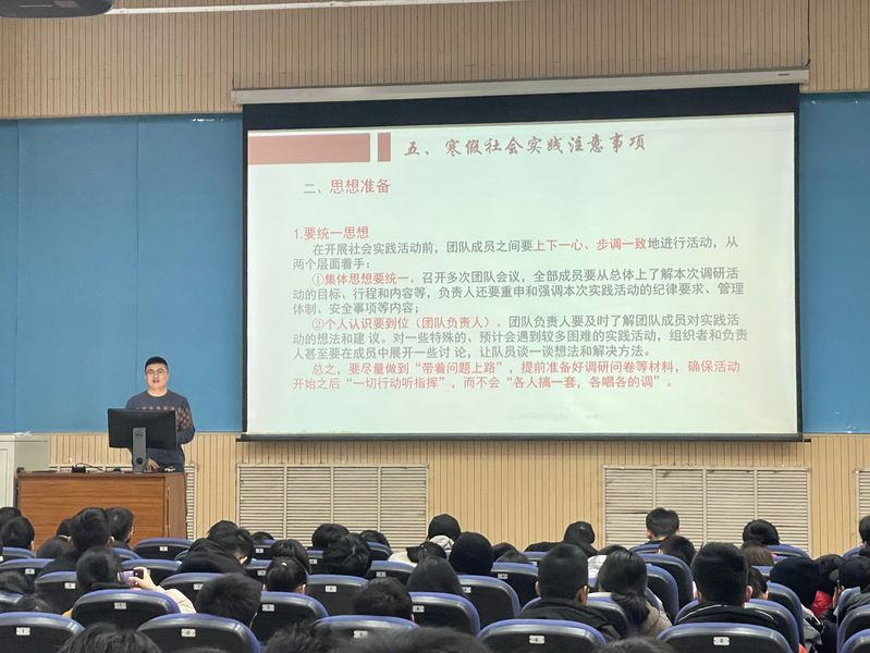 动员会伊始,辅导员李寿玺首先为大家解读实践的含义、社会实践的重要性及其之于大学生的意义三个方面,对相关调研主题进行详细介绍,并重点强调实践活动过程中应该注意的安全问题、注意事项。为使学生深入了解寒假社会实践相关事宜,学院探路者志愿服务与社会实践中心郭晓雨同学对寒假社会实践通知和要求、材料提交、新闻宣传等方面做出细致讲解,围绕“如何写好一篇稿件”讲解新闻稿撰写和投稿的要求,并分享相关投稿渠道和方法,鼓励同学们多读多写,把宣传工作做到位。最后,再次对安全问题进行强调,尤其在疫情反复情况下,减少流动,坚持“就近就便、灵活多样”的原则,按照疫情防控常态化要求,通过线下与线上结合的方式,就近、就便灵活开展社会实践。不组织开展聚集性实践活动,不在疫情中高发地区开展实践活动,线下实践活动不跨省、不跨市。