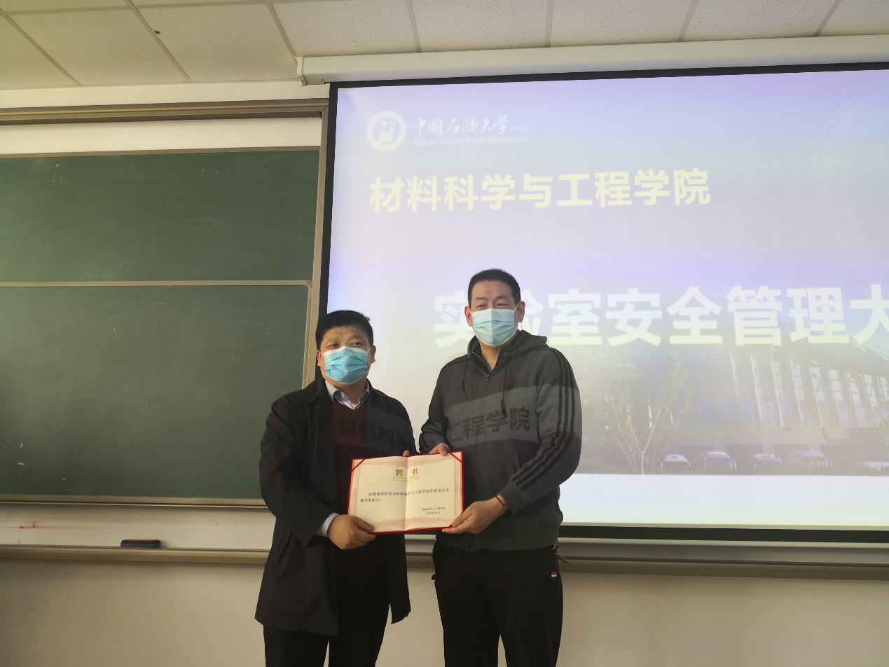 随后,孙道峰代表学院向周欣明老师颁发了“料科学与工程学院实验室安全督导组组长”的聘书,周欣明老师表示一定要根据教育部以及学校的有关规定,配合学院做好实验室安全督导工作。