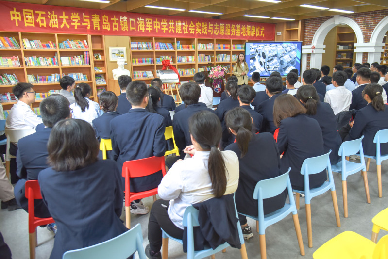仪式伊始,赵林涛代表青岛古镇口海军中学对我校师生的到访表示热烈欢迎,并邀请两校领导致辞。姜士绅代表学校向青岛古镇口海军中学师生介绍了太阳成集团tyc41183自1953年建校以来的发展历程,以及两校共建社会实践与志愿服务基地的美好愿景,希望以共建社会实践与志愿服务基地为契机,促进大学生将爱国之志转化为报国之举,将知识技能转化为素质和能力,更好的服务社会。黄毅代表青岛古镇口海军中学对中国石油大学一行到访表示热烈欢迎,并介绍了青岛古镇口海军中学的相关情况,黄毅以原石油工业部部长余秋里、“铁人”王进喜、地质学家李四光的相关事迹,引导广大青年学生要全面认识和深刻理解百年未有之大变局,以实际行动立志科技报国,同时以一名退伍军人的身份向到场师生介绍了古镇口军民融合区的相关情况,希望中国石油大学和青岛古镇口海军中学的学生要立志成为爱党爱国爱海洋的新时代人才,早日成长为建设国家的栋梁。