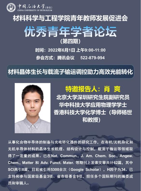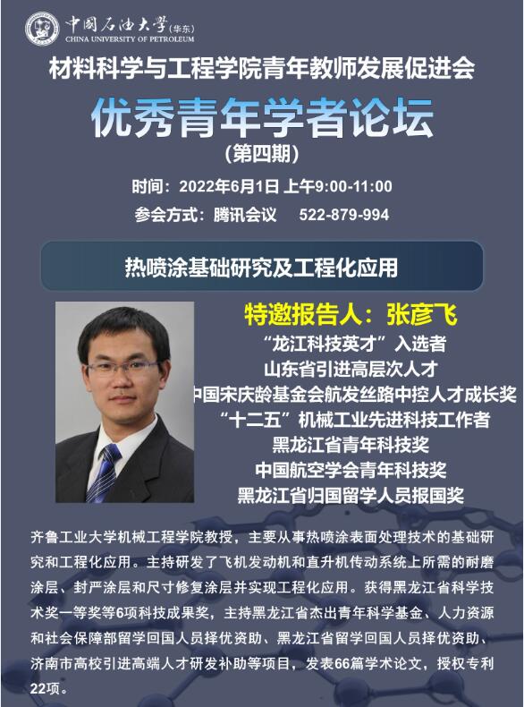 学院青年教师发展促进会将于6月1日(周三)上午举办“优秀青年学者论坛(第四期)”活动,我们有幸邀请了齐鲁工业大学张彦飞教授和北京大学深圳研究生院肖爽副研究员带来《热喷涂基础研究及工程化应用》、《材料晶体生长与载流子输运调控助力高效光能转化》的学术报告,欢迎各位老师和学生参会交流。 会议形式:腾讯会议 会议号:522879994 时间:2022年6月1日上午9:00-11:00