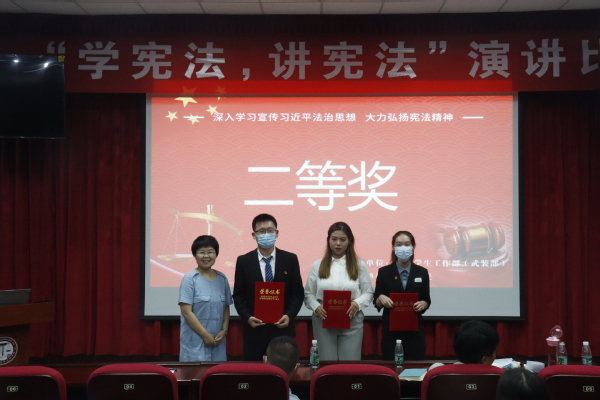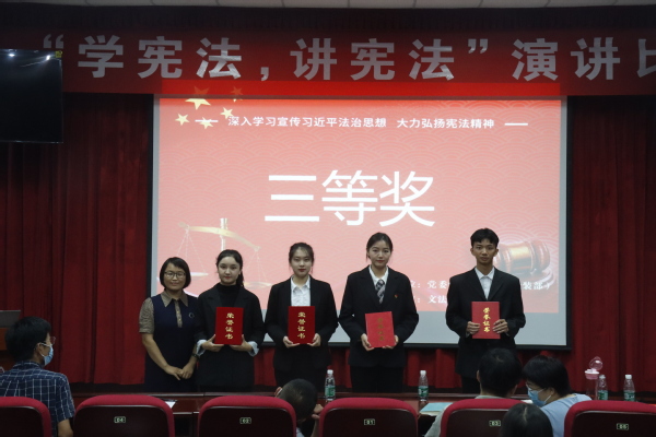 本次“学宪法,讲宪法”演讲比赛是由党委学生工作部(武装部)主办,文法学院承办,党委学生工作部(武装部)思政科郑健,文法学院副院长冷凌副教授,中文系齐卫华副教授,法学系谌爱华副教授、李猛博士担任评委,共评选出一等奖2人,二等奖3人,三等奖4人,优秀奖8人。