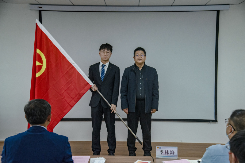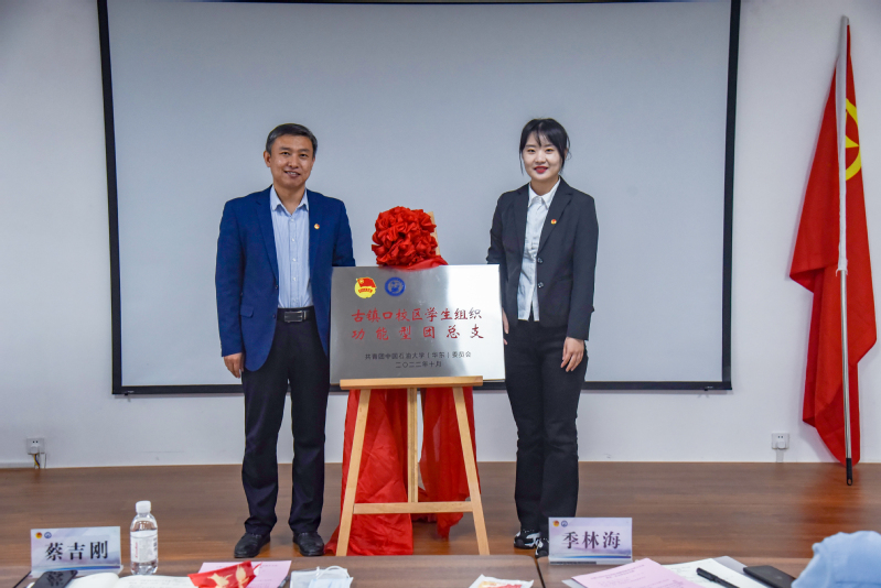 蔡吉刚与古镇口校区学生组织功能型团总支负责人李娇同学共同为“古镇口校区学生组织功能型团总支”揭牌。随后,周世光向团总支授团旗,并由石大山能新能源学院主席团成员陶志雄同学接旗。