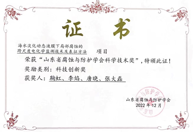 近日,山东省腐蚀与防护学会公布了2022年度山东省腐蚀与防护学会科学技术奖的评选结果,我院鞠虹副教授牵头申报的“海水淡化动态液膜下局部腐蚀的跨尺度电化学监测技术及表征方法”项目荣获科技创新奖。