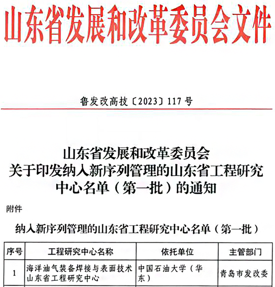 近日,山东省发展和改革委员会发布了《关于印发纳入新序列管理的山东省工程研究中心名单(第一批)的通知》,依托我院建设的海洋油气装备焊接与表面技术山东省工程研究中心纳入新序列管理。