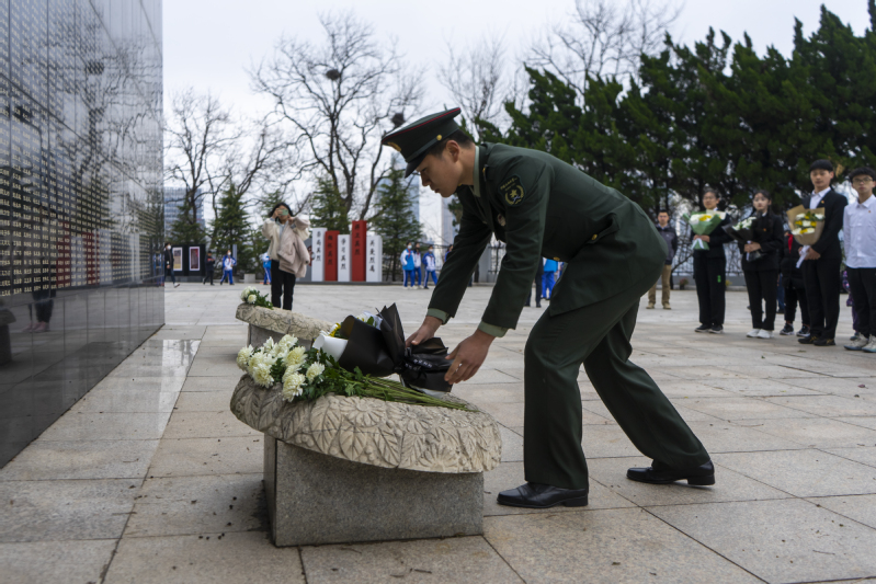 学生代表、退伍大学生士兵孙晓烨向革命烈士献花 魏欣悦摄影