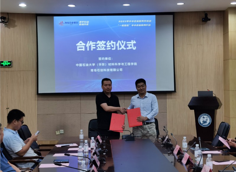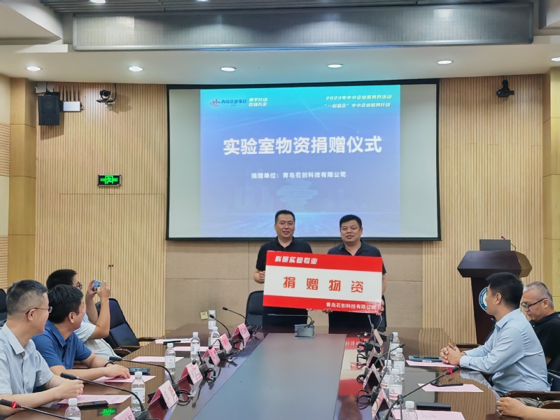 本次活动聚焦新材料领域,发布了学院在新材料智能开发、绿色能源材料、高端化工材料、能源装备及防护等领域各类创新成果20余项,积极展现了学院在此领域科技成果转化及产业化情况,受到参会企业的认真关注。参会企业积极发布各自技术创新需求,并与学院专家教授开展面对面对接洽谈,达成多项持续对接意向,其中青岛石创科技有限公司,青岛海研电子有限公司等企业,现场与学院签订意向合作协议,将在抗老化材料应用、废旧材料循环再利用、净水系统、油水分离等领域开展产学研深度合作,进一步提升企业技术创新能力和产品竞争力。青岛石创科技有限公司现场捐赠实验室应急防污套装物资,常务副院长孙道峰代表学院接收实验室物资捐赠。