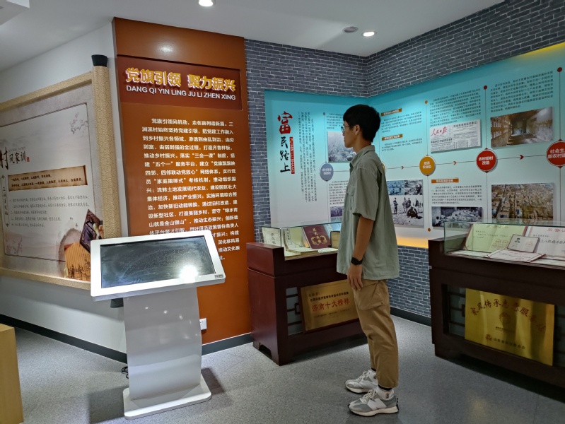 8月4日,实践队员前往济南市章丘区三涧溪村党史博物馆。场馆分为乡村记载和党史文化两个展区,展示着三涧溪村古往今来的历史事件、名人履迹、发展规划、等比缩放模型、党史教育等有关内容。实践队员着重参观党史文化展区,在该展区内聆听工作人员讲解,仔细阅读展厅中的村民奋斗故事及党的领导历程,深入了解到了三涧溪村“抓实党建强根基,党群联动村振兴”的乡村发展规划。最后实践队员与讲解员合影留念,并祝福三涧溪村在未来的发展中再创佳绩。