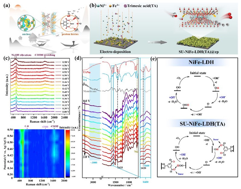 层状双金属氢氧化物(LDHs)是当前电催化水氧化领域中极具发展前景的催化剂之一。根据吸附演化机制,在水氧化过程中NiFe-LDH催化剂的过电位受到*O、*OH和*OOH结合能间比例关系限制,传统策略很难突破动力学瓶颈。更严重的是,在长期运行过程中,能量学有利的金属偏析会导致过渡金属连续浸出,阻碍规模化商业应用。为解决上述难题,团队受光系统II启发,提出静态-动态相容策略。通过电化学沉积技术成功制备高稳定性、高性能均苯三甲酸配位的亚尺寸镍铁层状氢氧化物催化剂(SU-NiFe-LDH(TA)),219 mV过电位即可达到10 mA cm-2,Tafel斜率低至31.1 mV dec-1。此外,该催化剂在1500 mA cm-2高电流密度下具有长达1300 h的OER稳定性,在工业测试环境(6 M KOH, 60oC)可稳定运行800 h以上,不会发生明显的性能衰减或结构塌陷。机理研究表明,层状双金属氢氧化物中的Fe和配位羧基之间通过C‒O‒Fe键的偶联可防止金属组分的溶解,从而通过静态配位稳定电子结构。通过动态演化形成的未配位羧基可作为质子摆渡促进OER中间体质子转移,以加速反应动力学。本工作通过引入具有静态和动态相容的功能配体,为突破析氧反应稳定性和动态性能方面提供了一条很有前景的途径。相关研究成果以题为“Bioinspired trimesic acid anchored electrocatalysts with unique static and dynamic compatibility for enhanced water oxidation”发表在Nature Communications(2023, 14, 6714,中科院一区TOP)。该论文第一作者为20级博士生林小靖,通讯作者为王兆杰副教授、刘思远副教授和鲁效庆教授。